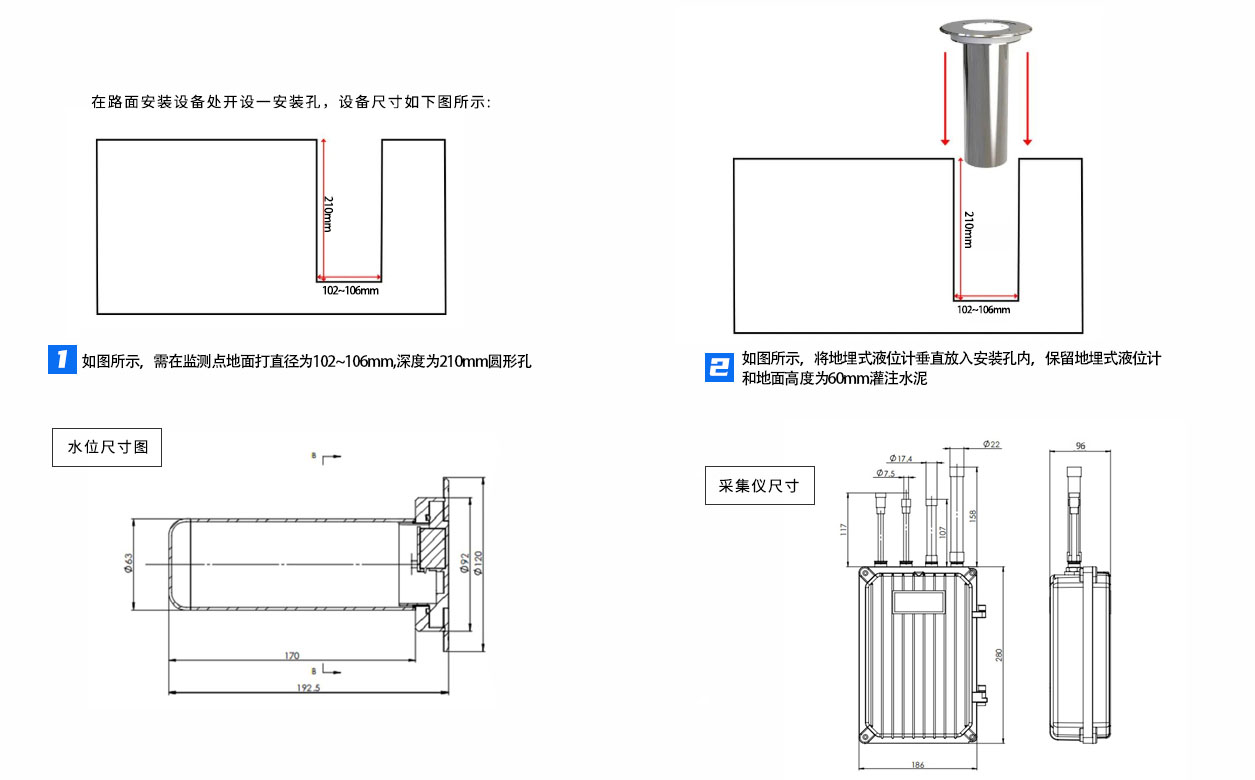 設(shè)備安裝采用地埋式安裝方式,不受地點(diǎn)限制,施工方便,只需安裝時(shí),頂部保持水平,以免影響測(cè)量